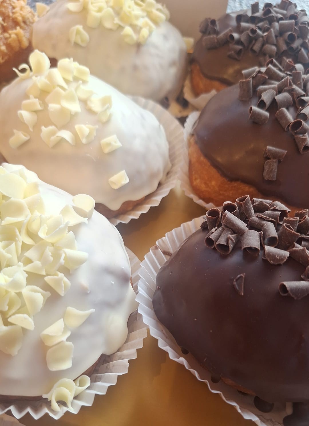 Gevuld met vloeibare chocolade, daarna gedipt in chocolade, topping chococrunch.