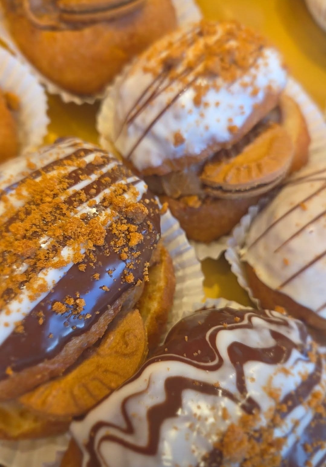 Gevuld met speculoos creme, gedipt in chocolade, topping Bischoff kruimels